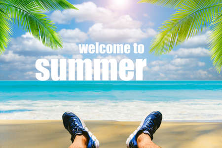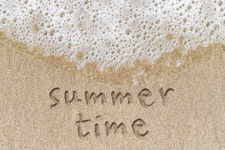 Summer inscription on the beach sand by the sea or ocean. Summer mood lifestyle concept.