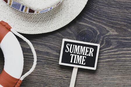 Summer time text on a small chalk board and wooden table. View from above. High resolution photography.
