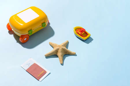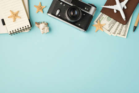 Top view photo of notebooks camera pen plane model on passport cover with dollars seashell and starfishes on isolated pastel blue background with blank space