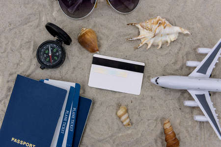 Travel concept with suitcase, passport, sunglasses and seashells on sand