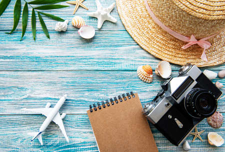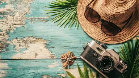 Travel essentials like a camera, hat, and sunglasses, arranged for a summer vacation concept with room for text.