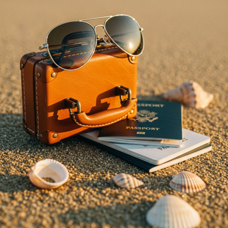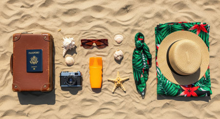 A collection of essential items laid out on the sand, ready for a beach vacation. The items include a vintage camera, sunglasses, seashells, a starfish, a yellow drink, a straw hat, a colorful towel, and a passport.