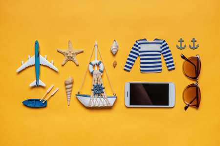 Various decorative nautical items, plane, sailboat, sunglasses and smartphone on bright yellow background. Sea travel, summer vacation at ocean concept. Flat lay, top view.