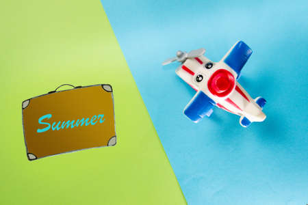 Flat lay design of travel concept with plane and travel bag on blue and pink background.