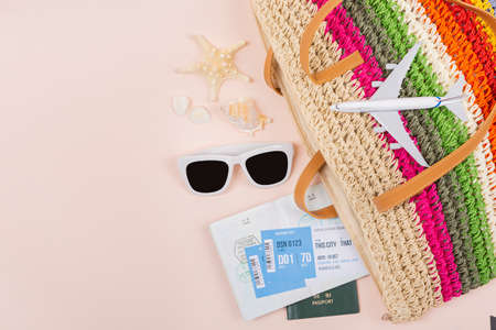 vaccine passport travel objects: flat lay of hat, sunglasses syringe, on pink background. virus certificate proof fortravelers tourists