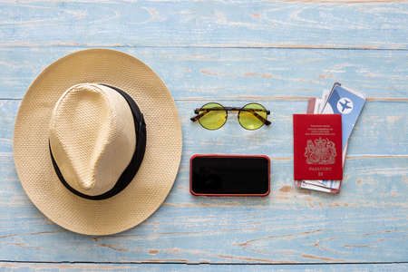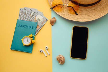 Summer vacation composition. Sunglasses, smartphone, hat and passport with money banknotes on blue yellow background
