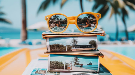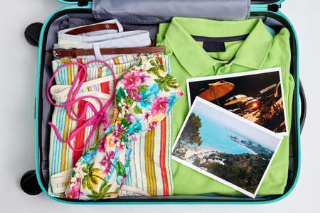 Pictures of resorts and beach clothing. Suitcase ready for your departure.