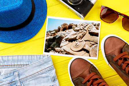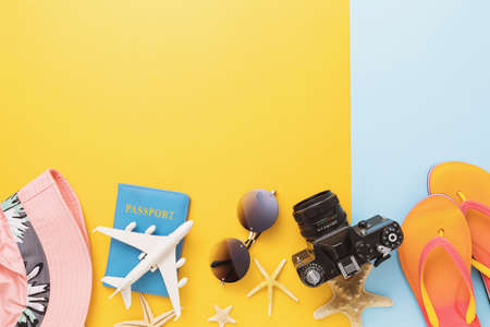 Flat lay travel accessories and retro camera on yellow background. Summer beach background. Top view vacation concept