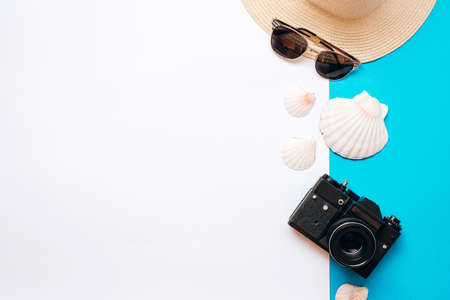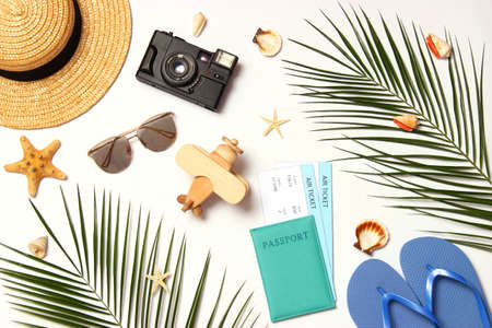 Summer travel vacation background with sun hat, camera, sea shells, tropical palm leaf on white background. Flat lay composition with beach accessories. Top view with copy space.
