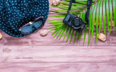 Flat lay of travel accessories Background concept. Camera, Hat, sun glasses, green leaf and small rocks on the wooden background. Top view with copy space.