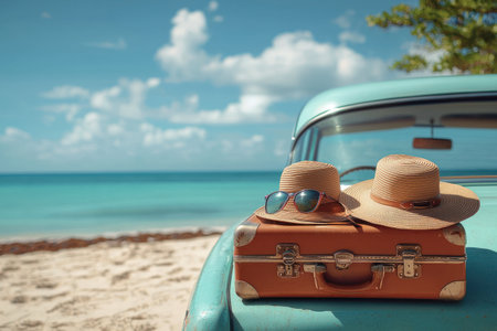 A vintage car parked by beach with suitcase on trunk, adorned with summer hats and sunglasses, evoking relaxing vacation vibe