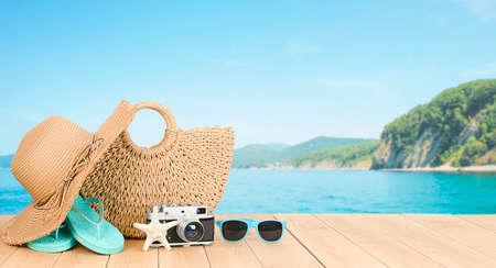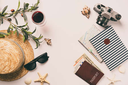 Travel accessories with empty space for text. Travel vacation concept. Summer background. Beach fashion , summer concept. Road frame set. Flat lay, top view