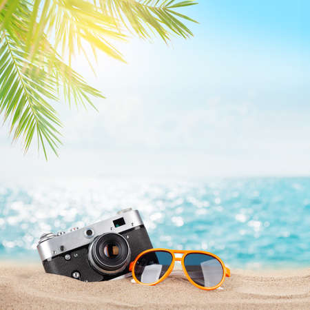 Retro camera and sunglasses on tropical beach with palm leaves and bright sand. Summer sea vacation and travel concept with copy space