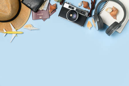 wallet, headphone and passport on blue background for summer holiday and vacation concept.