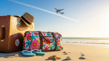 A vintage brown suitcase and a colorful floral duffel bag sit on a sandy beach next to blue flip-flops and seashells. A straw hat rests on of the suitcase. In the background, the ocean meets the horizon under a clear blue sky, with an airplane leaving a contrail as it flies overhead. The scene evokes a sense of summer vacation and travel adventure, bathed in warm sunlight.