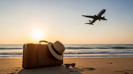 A vintage brown suitcase and a straw hat sit on a sandy beach, bathed in the warm glow of a sunset or sunrise. The ocean waves gently lap the shore in the background, and a airplane is captured mid-flight in the sky, leaving a faint contrail. This scene evokes a sense of wanderlust and the excitement of travel and vacation.