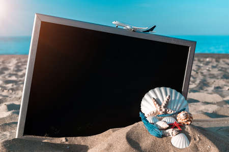 Sea shells. Starfish, seashells, toy plane and globe near blackboard on ocean nature beach. Tranquil beach scene with copy space