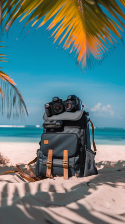 A sturdy backpack sits on the warm sand, topped with two cameras, while palm leaves sway gently overhead. The vibrant blue ocean and clear skies create a stunning tropical backdrop for exploration.