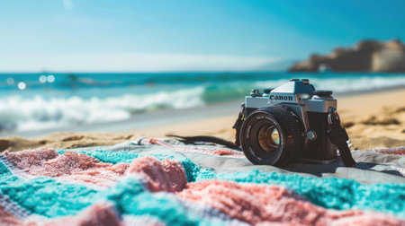 A camera is placed on a blanket at the beach, with the camera lens pointing towards the sea. It appears to be a digital camera, possibly a pointandshoot or mirrorless interchangeablelens camera AIG50