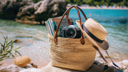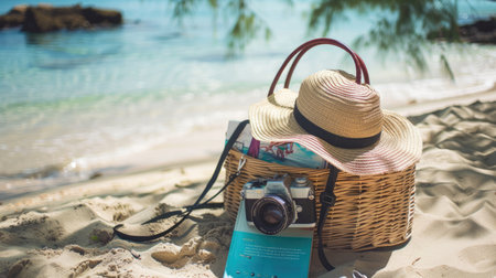 A waterresistant wicker basket packed with a hat, camera, and books rests on the sandy beach, blending wood, fashion accessories, and art into the coastal landscape AIG50