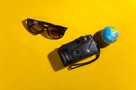 travel concept. Camera, globe, sunglasses on yellow background with shadow. top view