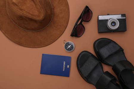travel planning. Sandals, hat and travel accessories on brown background. top view. flat lay