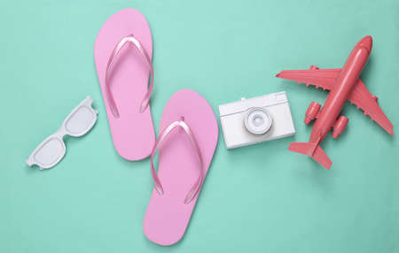 Minimalist travel layout. Flip-flops, white camera, air plane and sunglasses on mint blue background. top view. flat lay