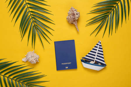 Seashells and sailboat, passport, palm green leaves on a yellow background. travel concept. tropical composition. top view. flat lay