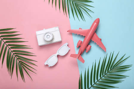 Air plane, camera, sunglasses and palm leaves on pink blue pastel background. travel concept. tropical composition. top view. flat lay