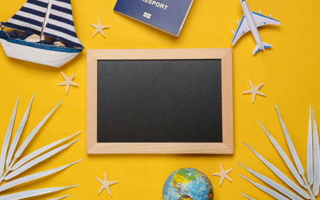 Empty chalk board with travel accessories and souvenirs on yellow background. Voyage, summer vacation concept. top view