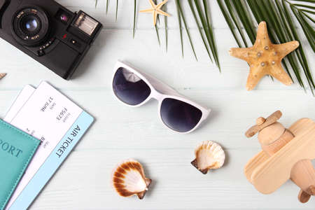 Tourist essentials on a white background. Passport, hat, passport, camera, sunglasses, sunblock cream, seashells