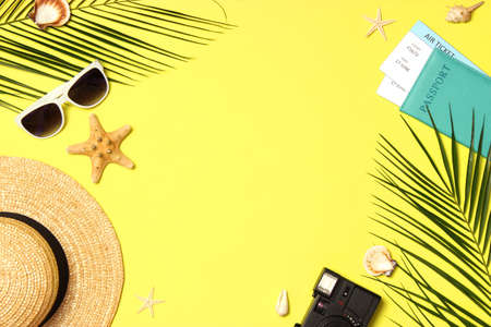 Flat lay traveler accessories on yellow background. Top view female beach hat, vintage camera, sunglasses, palm leaf. Travel or vacation concept. Summer background