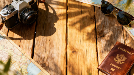 Travel accessories including a vintage camera, map, sunglasses, and passport are laid out on a rustic wooden table under warm sunlight, casting natural shadows. This evokes a sense of journey planning