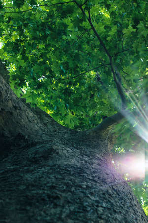 Looking up to an old tree and sunbeams through lush leaves. Summer chill background with old tree trunk and sun flare close up.