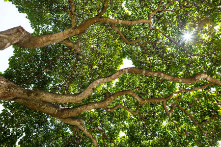 View from under green wide tree. Look up on sunshine breaking through the foliage