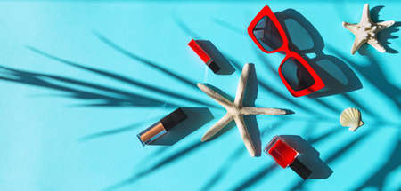 Set of decorative cosmetics and red sunglasses on blue background with palm tree leaf shadow. Summer beach accessories, make up and vacation beauty concept. top view. flat lay. creative layout