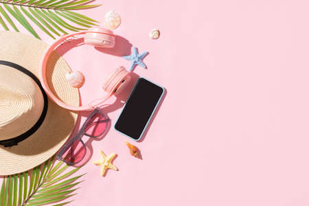 Summer backdrop with sedge hat, laptop, phone and palm leaf on pink background