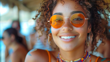 Woman with curly hair and round sunglasses smiling. The background is blurred with other people. Concept of happiness and summer vibes.
