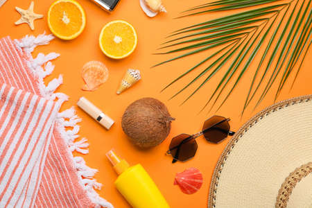 Set of beach accessories, palm leaf and fruits on color background