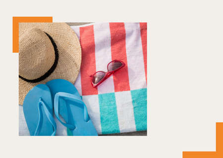 Beach essentials with a straw hat, sunglasses, and flip-flops. Summer vacation accessories on a patterned towel. Concept of travel, holiday, beachwear, and relaxation.