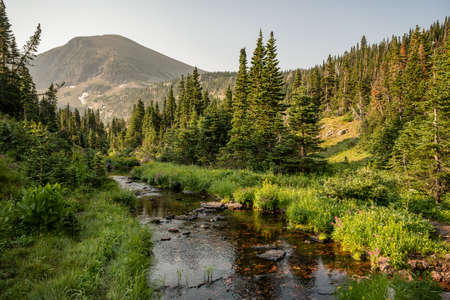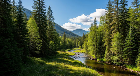 A pristine forest stream winds through tall trees towards a majestic mountain, creating a tranquil and scenic landscape perfect for showcasing nature's beauty and travel themes.