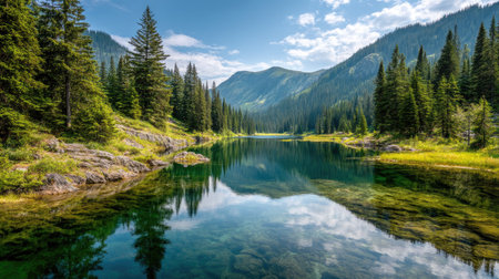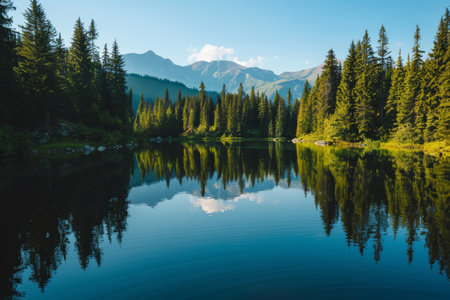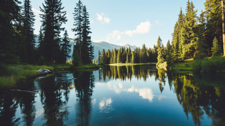 A tranquil mountain lake, surrounded by a lush forest, mirrors the serene beauty of nature in its still waters, creating a perfect symmetrical reflection
