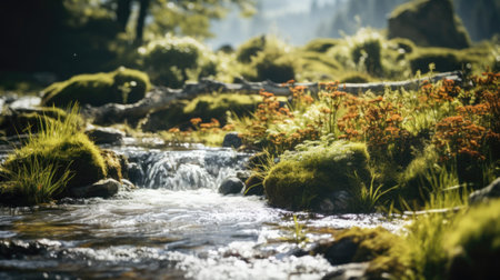 rocky mountain stream in the morning light, rendered in the style of unreal engine. the scene showcases a beautiful combination of light navy and amber tones, reminiscent of the works of marcin sobas and the whistlerian style. with its horizons and light-filled scenes, this image captures the essence of american tonalist art. ai generated