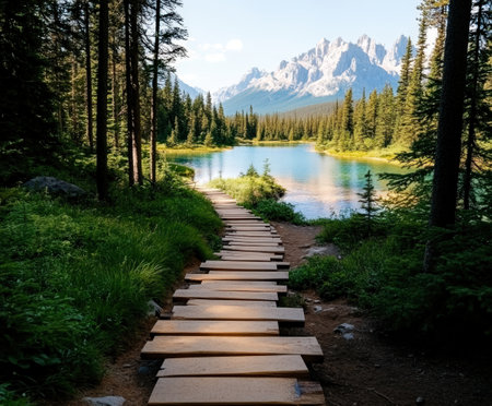 Scenic pathway through lush forest to serene mountain lake under clear sky.