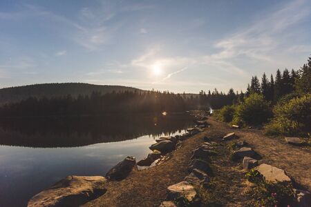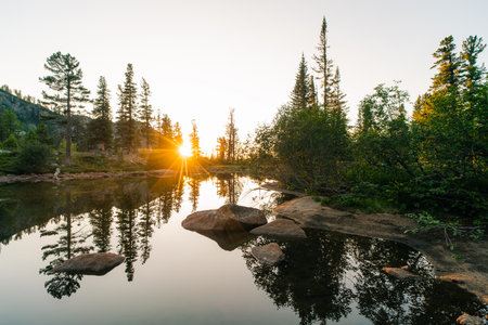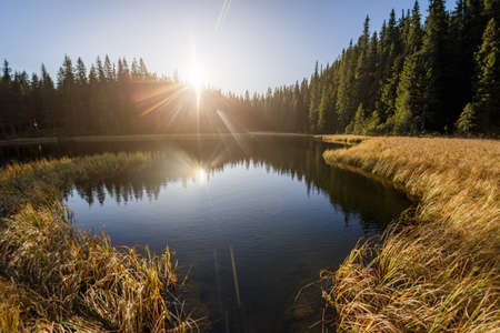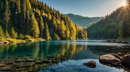 Morning landscape with lake in a mountain forest. The first rays of the sun in the trees.