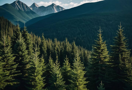 Majestic mountains tower over a serene spruce forest beneath a dramatic sky, showcasing nature beauty at dusk. Towering mountains with rolling hills and moody sky highlighting peaceful wilderness. AI.