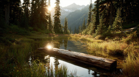 Serene lake scene in a forest. Sunlight streams through the trees, illuminating the still water and a fallen log that spans the water. The surrounding forest is lush and green, and the mountains rise in the background.