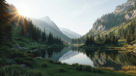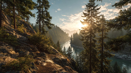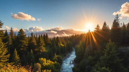 Sunlight Breaks Through Forest Canopy Over Serene Mountain River Landscape