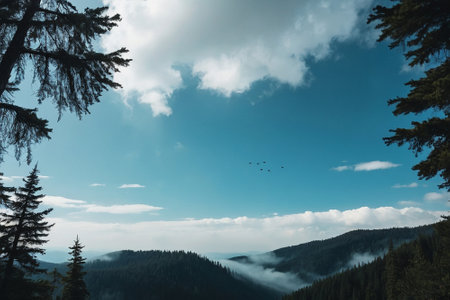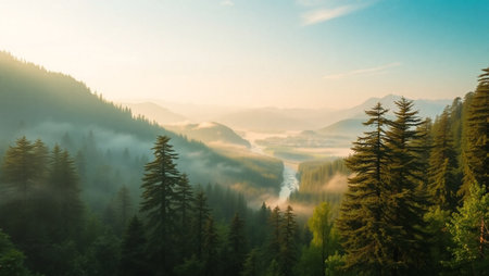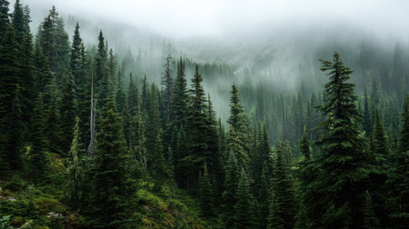 Experience the serene beauty of a misty forest landscape with lush green trees, soft fog enveloping the mountains, creating a tranquil outdoor environment.