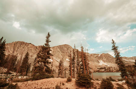 Beautiful view of the lake in the mountains at sunset. Panorama